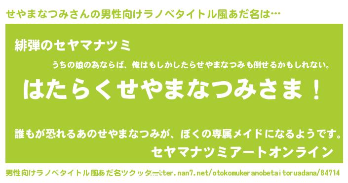 | 胡散臭い通販商品みたいなあだ名 | 『必ず成功する霊験あらたかなお札…その名も「せやまなつみ」』 |