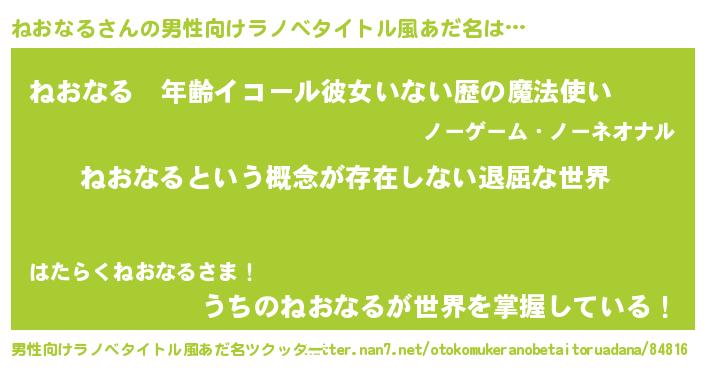 | 女子向けラノベタイトル風あだ名 | 『異世界で失敗しない100のねおなる』 |