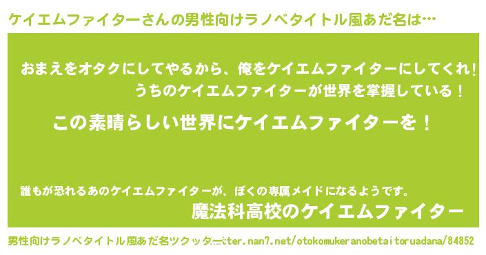 | 伝説のあだ名 | 『救世主となる錬金術士ケイエムファイター』 |