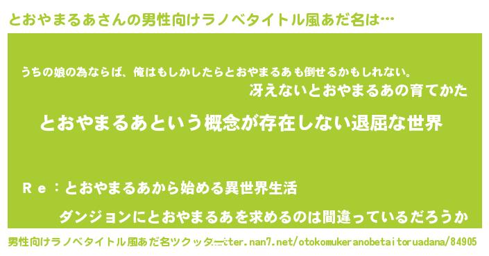 | 女子向けラノベタイトル風あだ名 | 『異世界で失敗しない100のとおやまるあ』 |