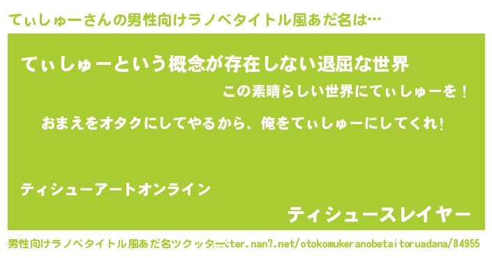 | ヘコむあだ名 | 『てぃしゅー(笑)』『てぃもー』 |