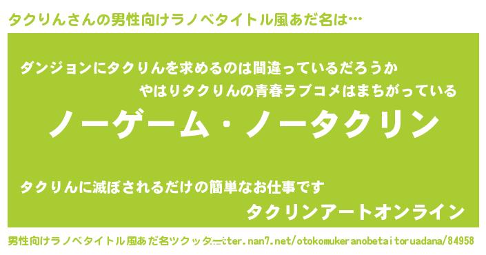 | 女子向けラノベタイトル風あだ名 | 『死神タクりんの再婚』 |