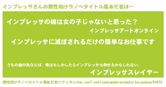 | 女子向けラノベタイトル風あだ名 | 『横柄インプレッサと宰相陛下』 |