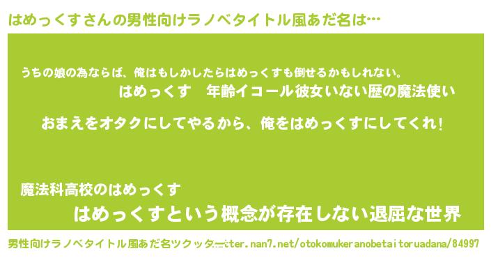 | 女子向けラノベタイトル風あだ名 | 『はめっくす夫妻のなれそめ』 |