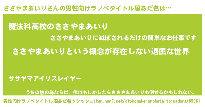 | 女子向けラノベタイトル風あだ名 | 『異世界で失敗しない100のささやまあいり』 |