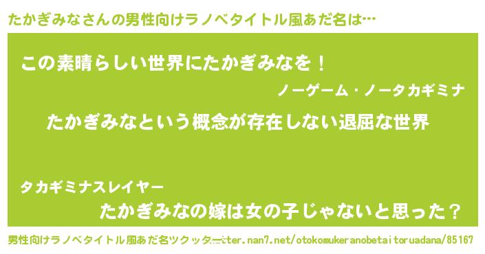 | 女子向けラノベタイトル風あだ名 | 『異世界で失敗しない100のたかぎみな』 |