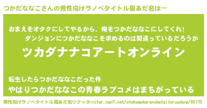 | 女子向けラノベタイトル風あだ名 | 『誰かこのつかだななこを説明してください! ~契約から始まるウェディング~』 |