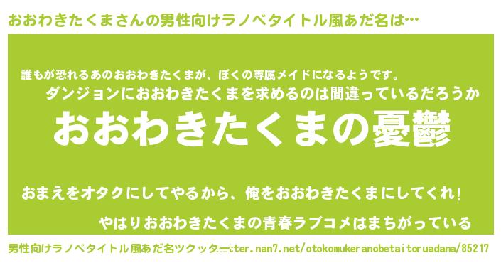 | 女子向けラノベタイトル風あだ名 | 『(仮)おおわきたくまのやんごとなき事情』 |