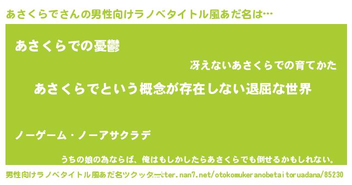 | 女子向けラノベタイトル風あだ名 | 『異世界で失敗しない100のあさくらで』 |