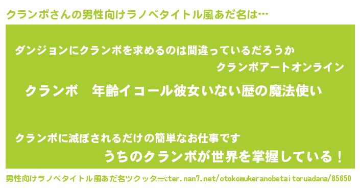 | 女子向けラノベタイトル風あだ名 | 『クランボの玉の輿計画!』 |