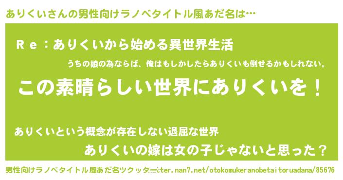 | 女子向けラノベタイトル風あだ名 | 『乙女ゲームの破滅フラグしかない悪役ありくいに転生してしまった…』 |
