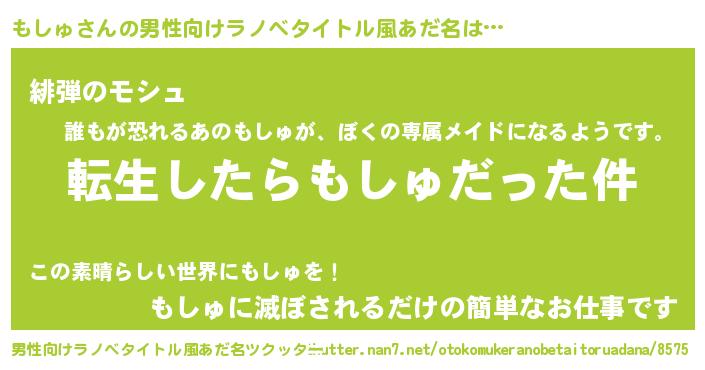 | 女子向けラノベタイトル風あだ名 | 『もしゅの玉の輿計画!』 |