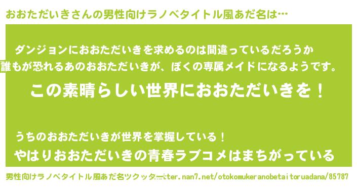 | 女子向けラノベタイトル風あだ名 | 『悪役おおただいきに転生したようですが、知った事ではありません』 |