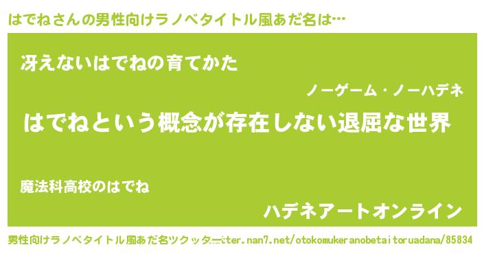 | 胡散臭い通販商品みたいなあだ名 | 『絶対に幸福をもたらす健康食品…その名も「はでね」』 |