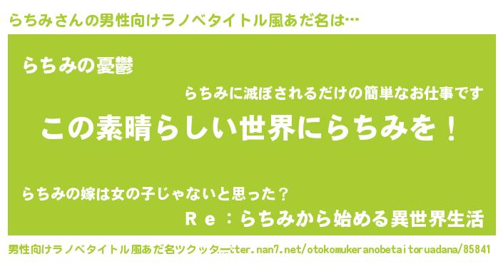 | 女子向けラノベタイトル風あだ名 | 『乙女ゲームの破滅フラグしかない悪役らちみに転生してしまった…』 |