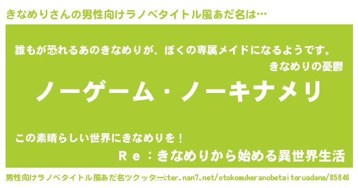 | 女子向けラノベタイトル風あだ名 | 『死神きなめりの再婚』『闇のきなめり』 |