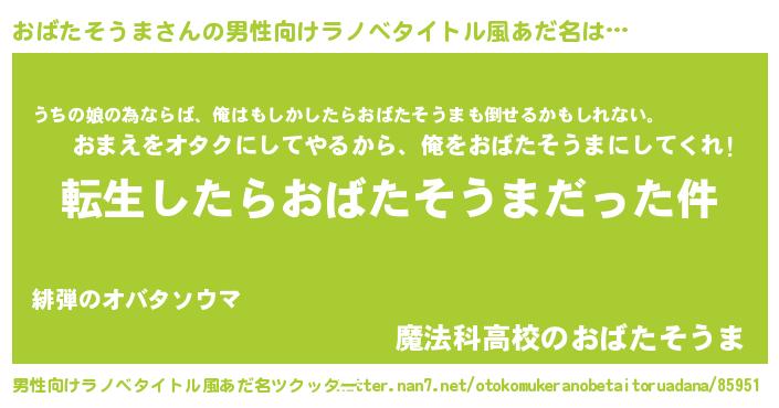 | 女子向けラノベタイトル風あだ名 | 『おばたそうまの玉の輿計画!』 |