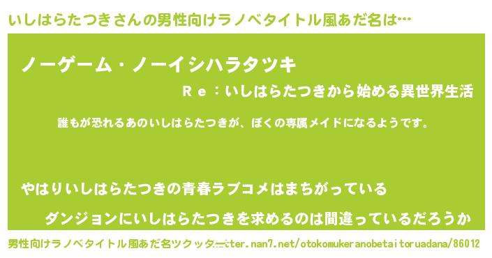 | 胡散臭い通販商品みたいなあだ名 | 『前代未聞の健康食品…その名も「いしはらたつき」』 |