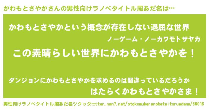 | 女子向けラノベタイトル風あだ名 | 『悪役かわもとさやかに転生したようですが、知った事ではありません』 |