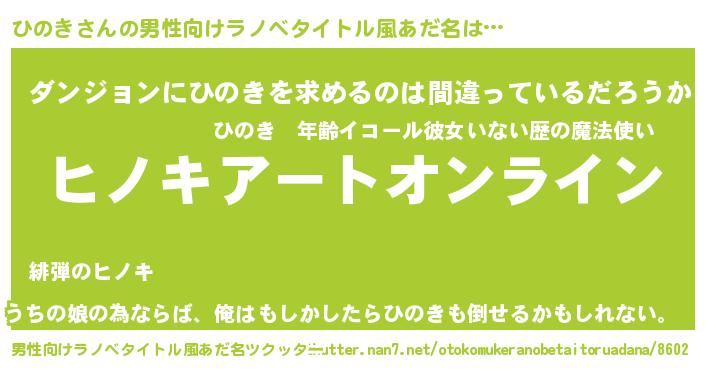 | 胡散臭い通販商品みたいなあだ名 | 『億万長者になれるブレスレット…その名も「ひのき」』 |