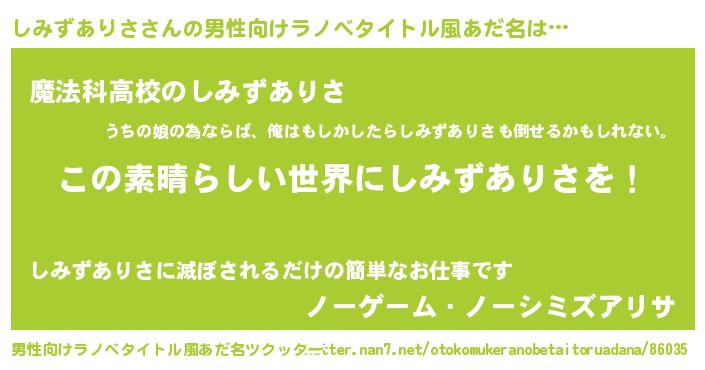 | 女子向けラノベタイトル風あだ名 | 『悪役しみずありさに転生したようですが、知った事ではありません』 |