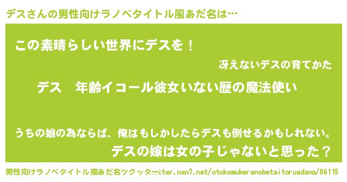 | 女子向けラノベタイトル風あだ名 | 『デスの玉の輿計画!』『デス様がみてる』 |