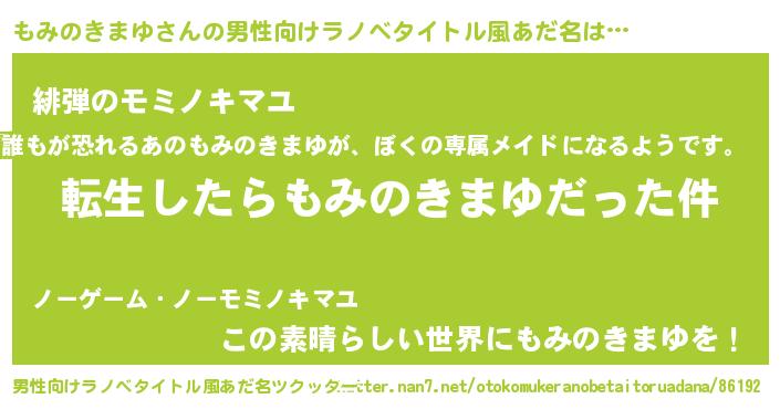 | 女子向けラノベタイトル風あだ名 | 『婚約破棄系悪役もみのきまゆに転生したので、保身に走りました。』 |