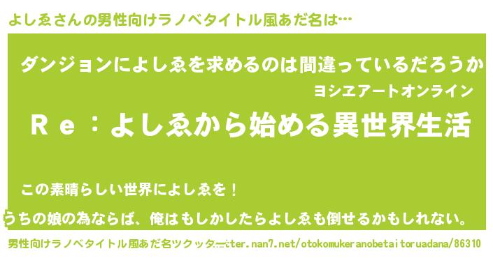 | 女子向けラノベタイトル風あだ名 | 『闇のよしゑ』『よしゑの卵を拾いまして』 |