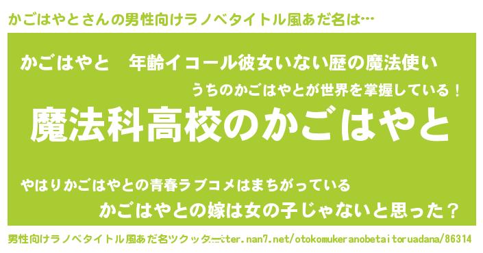 | 女子向けラノベタイトル風あだ名 | 『かごはやとなんてお断りですっ。』 |