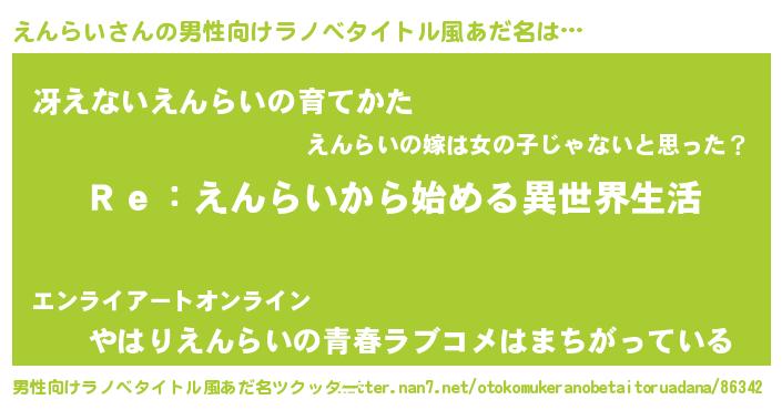 | 女子向けラノベタイトル風あだ名 | 『闇のえんらい』『えんらい伯爵の花嫁』 |