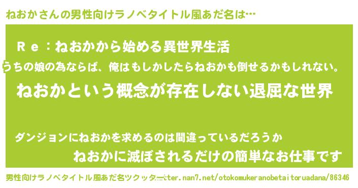 | 女子向けラノベタイトル風あだ名 | 『異世界で失敗しない100のねおか』 |