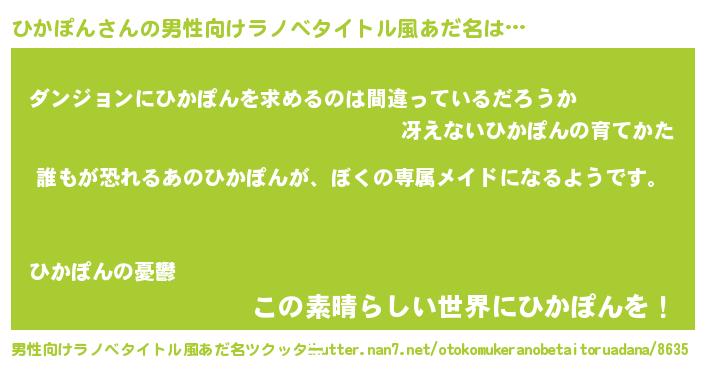 | 胡散臭い通販商品みたいなあだ名 | 『来世でも幸せになれる水素水…その名も「ひかぽん」』 |