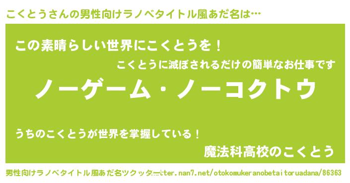 | 女子向けラノベタイトル風あだ名 | 『死神こくとうの再婚』 |