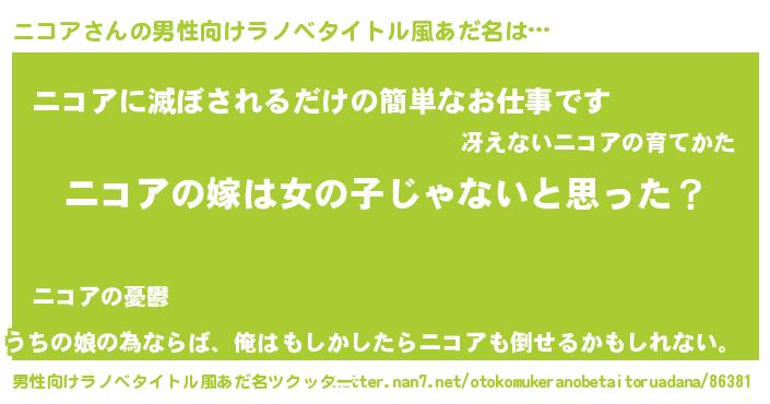 | 女子向けラノベタイトル風あだ名 | 『ニコア様がみてる』『ニコアの婚約者』 |