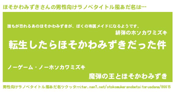 | 女子向けラノベタイトル風あだ名 | 『ほそかわみずきの玉の輿計画!』 |