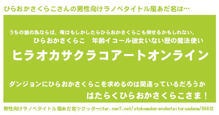 | 女子向けラノベタイトル風あだ名 | 『ひらおかさくらこ姫と円卓の騎士』 |