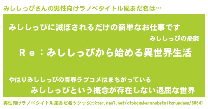 | 意味不明あだ名 | 『自称みししっぴ』『永久保存みししっぴ』 |