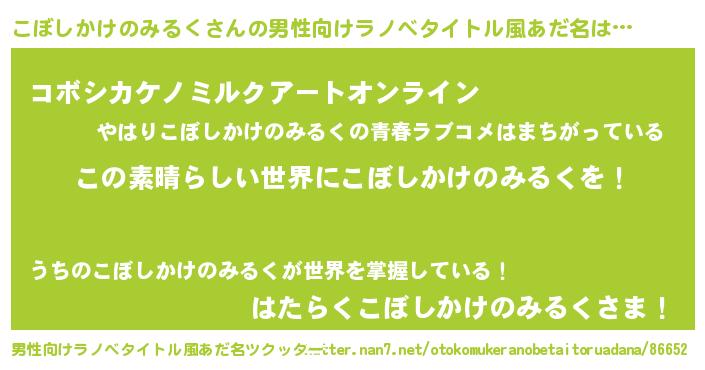 | 意味不明あだ名 | 『住所不定無職こぼしかけのみるく(84歳)』 |