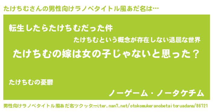 | 女子向けラノベタイトル風あだ名 | 『たけちむの卵を拾いまして』 |