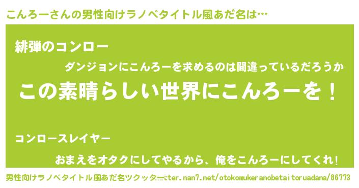 | 女子向けラノベタイトル風あだ名 | 『乙女ゲームの破滅フラグしかない悪役こんろーに転生してしまった…』 |