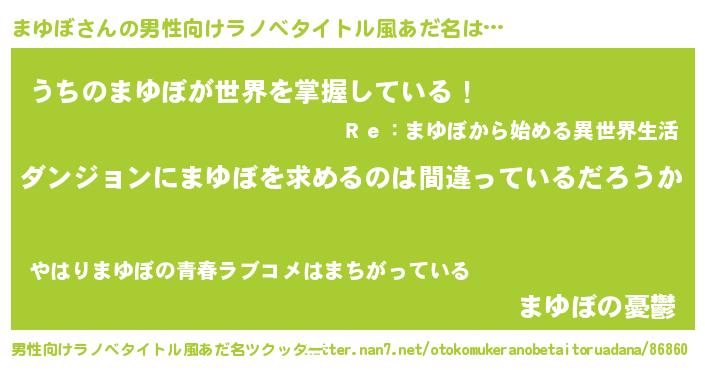| 女子向けラノベタイトル風あだ名 | 『まゆぼの卵を拾いまして』『闇のまゆぼ』 |
