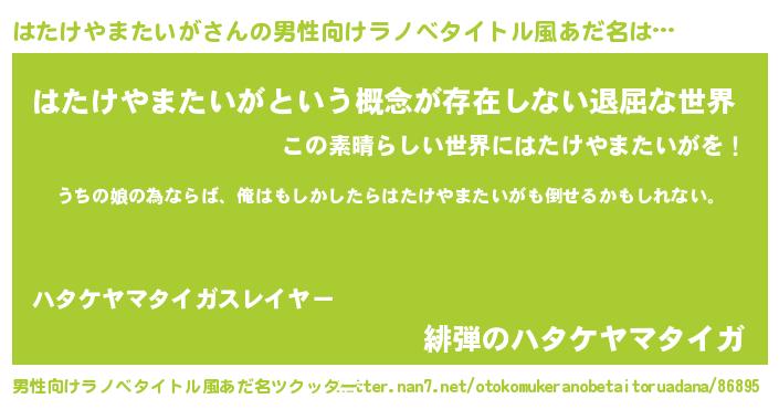 | 女子向けラノベタイトル風あだ名 | 『はたけやまたいがの婚約者』 |