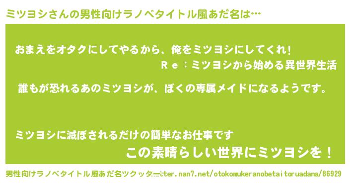 | 女子向けラノベタイトル風あだ名 | 『ミツヨシの契約王妃』 |