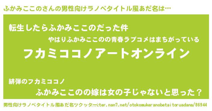 | 女子向けラノベタイトル風あだ名 | 『誰かこのふかみここのを説明してください! ~契約から始まるウェディング~』 |