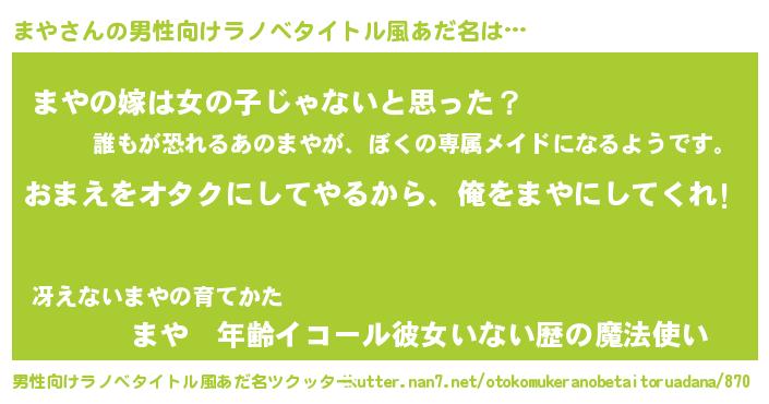 | 女子向けラノベタイトル風あだ名 | 『まや夫妻のなれそめ』 |
