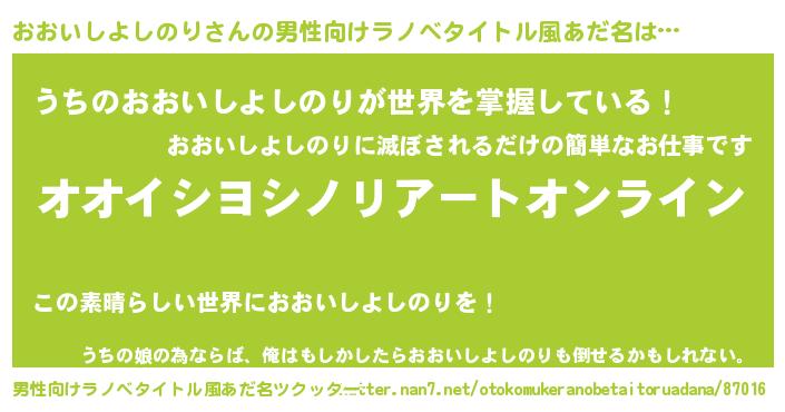 | 女子向けラノベタイトル風あだ名 | 『誰かこのおおいしよしのりを説明してください! ~契約から始まるウェディング~』 |