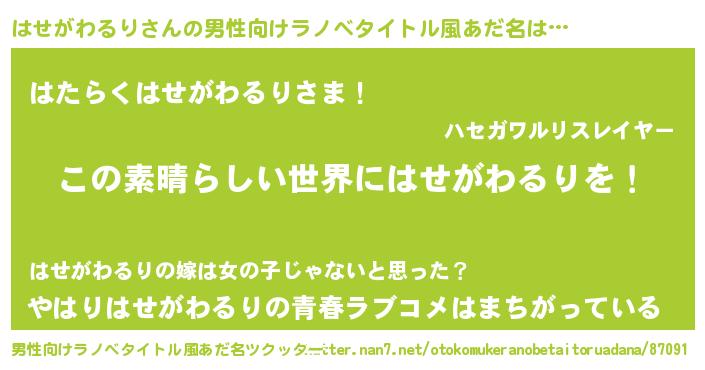 | 女子向けラノベタイトル風あだ名 | 『乙女ゲームの破滅フラグしかない悪役はせがわるりに転生してしまった…』 |