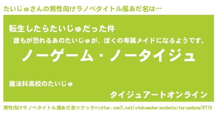 | 女子向けラノベタイトル風あだ名 | 『死神たいじゅの再婚』 |