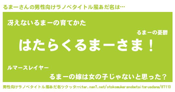| 胡散臭い通販商品みたいなあだ名 | 『信頼と実績のサプリメント…その名も「るまー」』 |