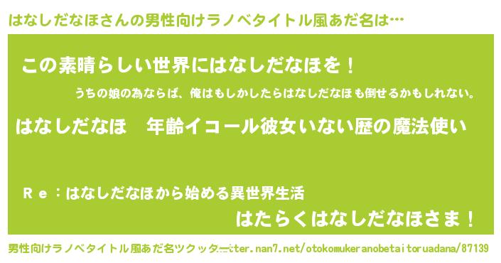 | 女子向けラノベタイトル風あだ名 | 『はなしだなほの玉の輿計画!』 |